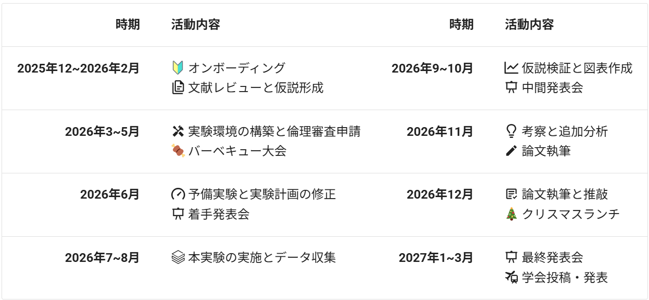 - 全体ゼミ:週1回(2コマ程度)